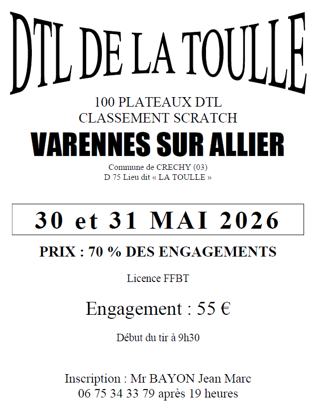 DTL DE LA TOULLE 100 PLATEAUX commune CRECHY (03) Détails de l'événement Du 30/05/2026 au 31/05/2026 Lieu : 03, CRECHY Par SOPHIE MERCIER Lieu de l'événement Détails